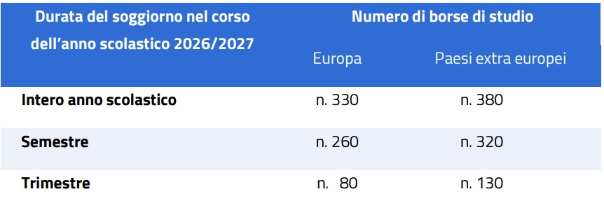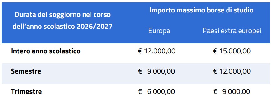 La borsa finanzia le spese per la frequenza, durante l’anno scolastico 2026/2027, di un periodo di studi all’estero. L’importo si differenzia in base alla destinazione e alla differente durata del soggiorno.