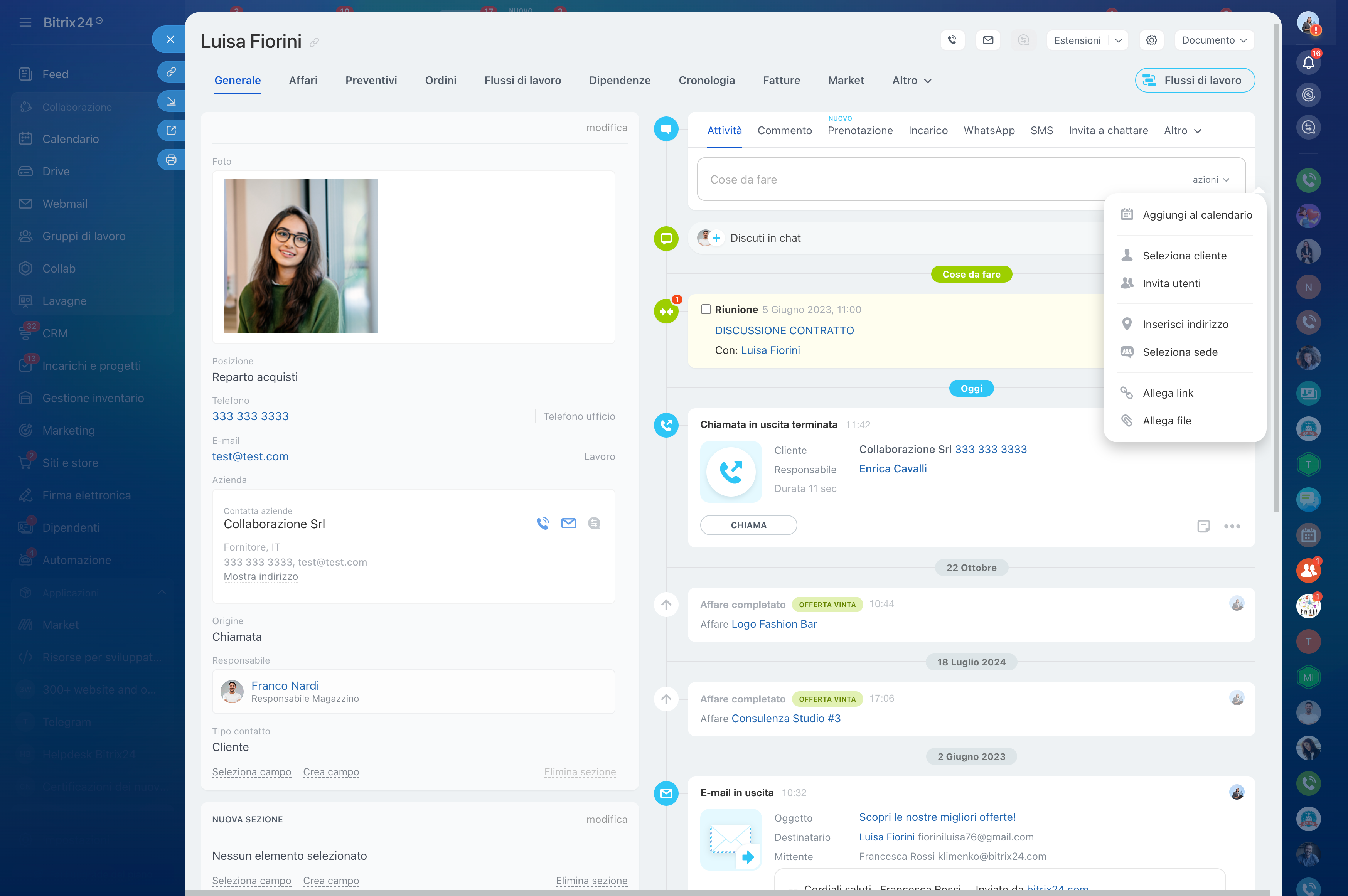 Ogni record contiene il Profilo del cliente, gli Affari e i lead collegati. In aggiunta, Bitrix24 permette di registrare in automatico ogni interazione - chiamate, email, messaggi gestiti tramite il Contact Center, di modo da consentire a tutti i membri del proprio team di lavoro di recuperare lo storico del rapporto in autonomia.
