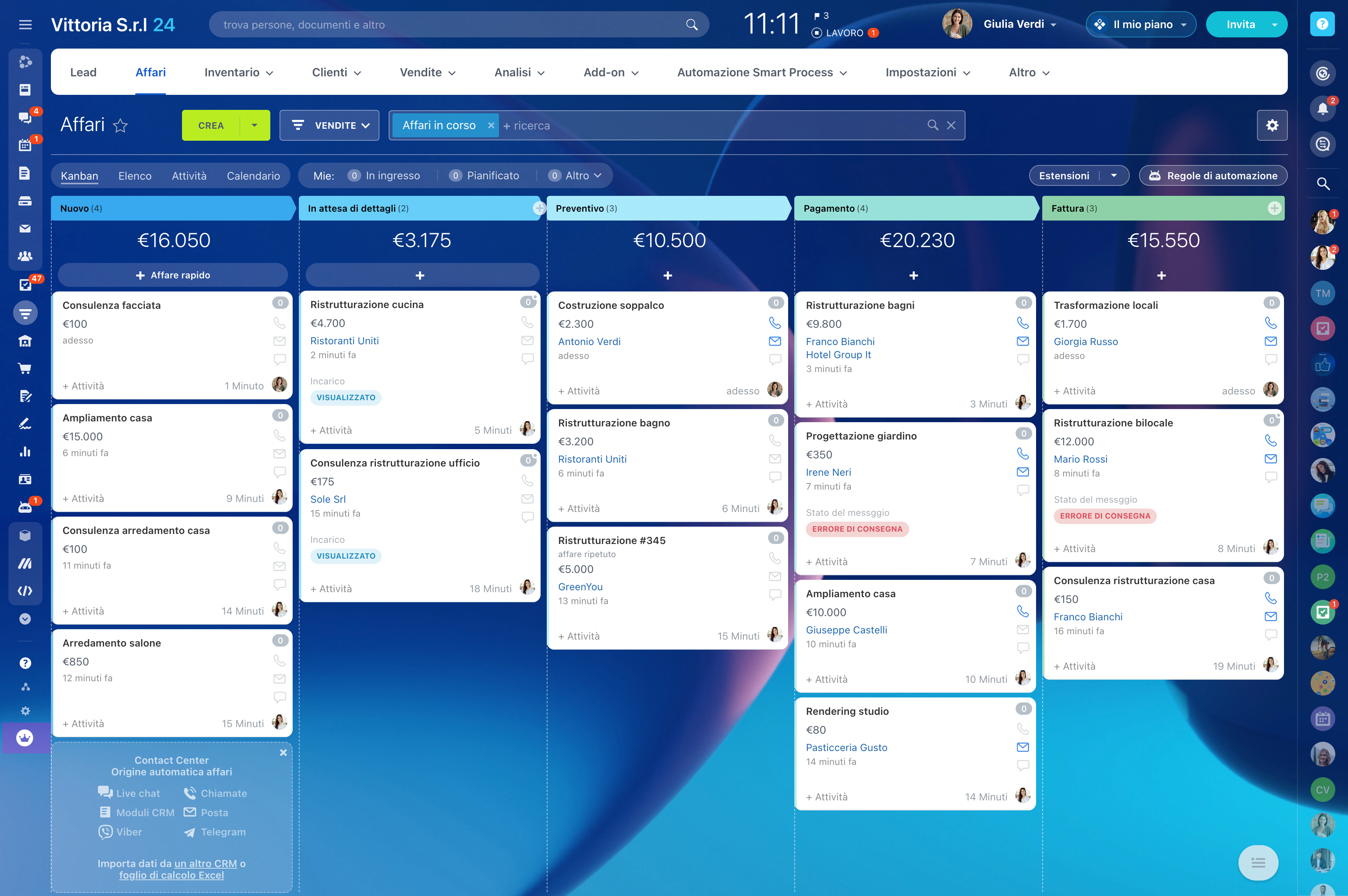 La visualizzazione Kanban consente di poter monitorare in maniera veloce e organizzata lo stato di un affare. Permette al team di vedere immediatamente dove si trova ciascun cliente nel percorso (es. “Nuovo Contatto”, “Trattativa”, “In Attesa di Firma”, “Fidelizzazione”) e di intervenire con l’azione più appropriata.