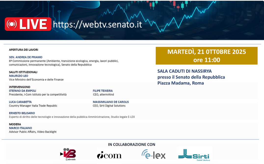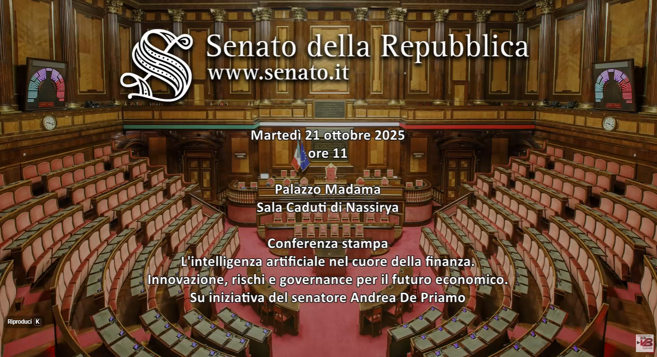 “L’intelligenza artificiale nel cuore della finanza: Innovazione, Rischi e Governance per il Futuro Economico” è il titolo della conferenza organizzata il 21 ottobre presso la Sala Caduti di Nassirya del Senato della Repubblica su iniziativa del Senatore Andrea De Priamo (FdI) in collaborazione con Video Backlight, I-Com, E-Lex e Sirti Digital Solutions, trasmessa in diretta streaming sulla web tv del Senato.