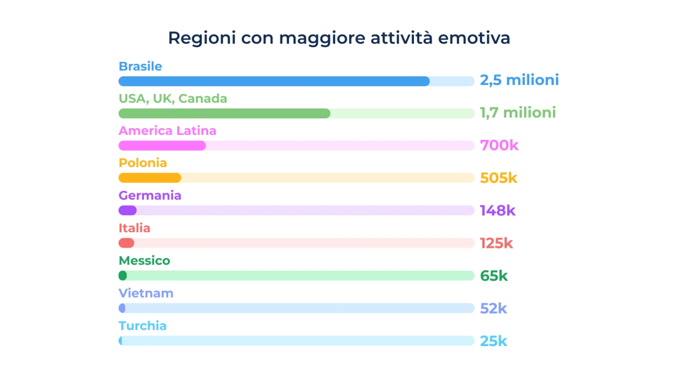 Tra quelli più espressivi (Reaction Totali) il Brasile è nettamente in testa (2.587.095 reaction totali al mese), seguito da Stati Uniti, Regno Unito e Canada, e America Latina. Nella top five rientrano poi Polonia e Germania, mentre l’Italia si colloca al sesto posto.