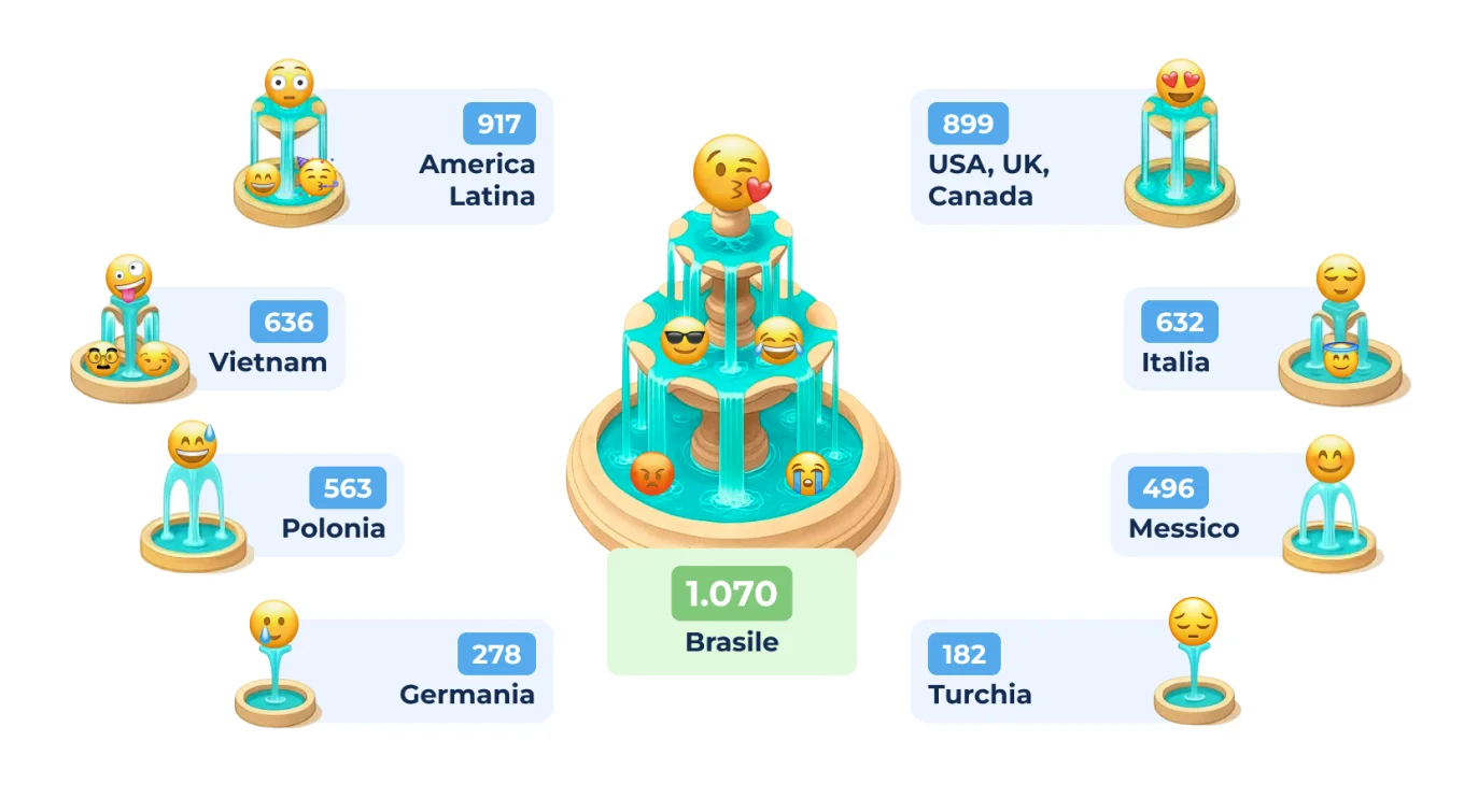 Secondo quanto evidenziato da Bitrix24, paesi come Figi, Bermuda e Filippine sono più espressivi e utilizzano un’ampia varietà di emoji per esprimere le proprie emozioni.