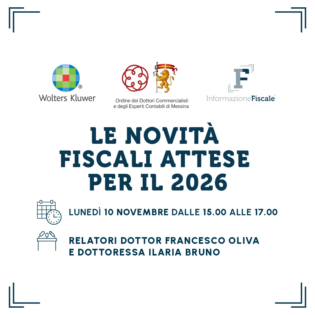 Evento formativo gratuito online organizzato in collaborazione con l'Ordine dei dottori commercialisti e degli Esperti Contabili di Messina e con Wolters Kluwer Italia: saranno approfondite le novità fiscali, del lavoro e di finanza agevolata in arrivo nel 2026, con particolare riferimento alle aziende e ai professionisti operanti nel Sud Italia