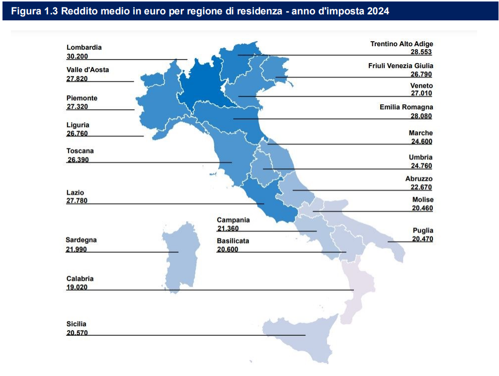 La regione con reddito medio complessivo più elevato è la Lombardia (con 30.200 euro), seguita dal Trentino Alto Adige (28.553 euro) e poi dall’Emilia Romagna, dove il valore medio è 28.080 euro.