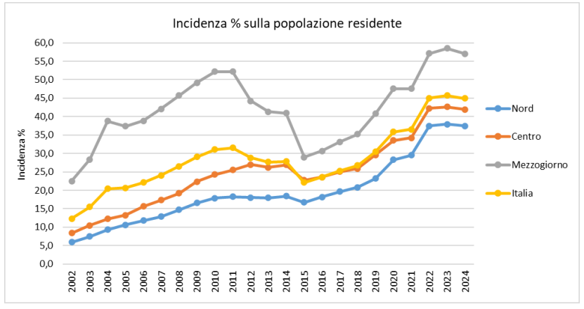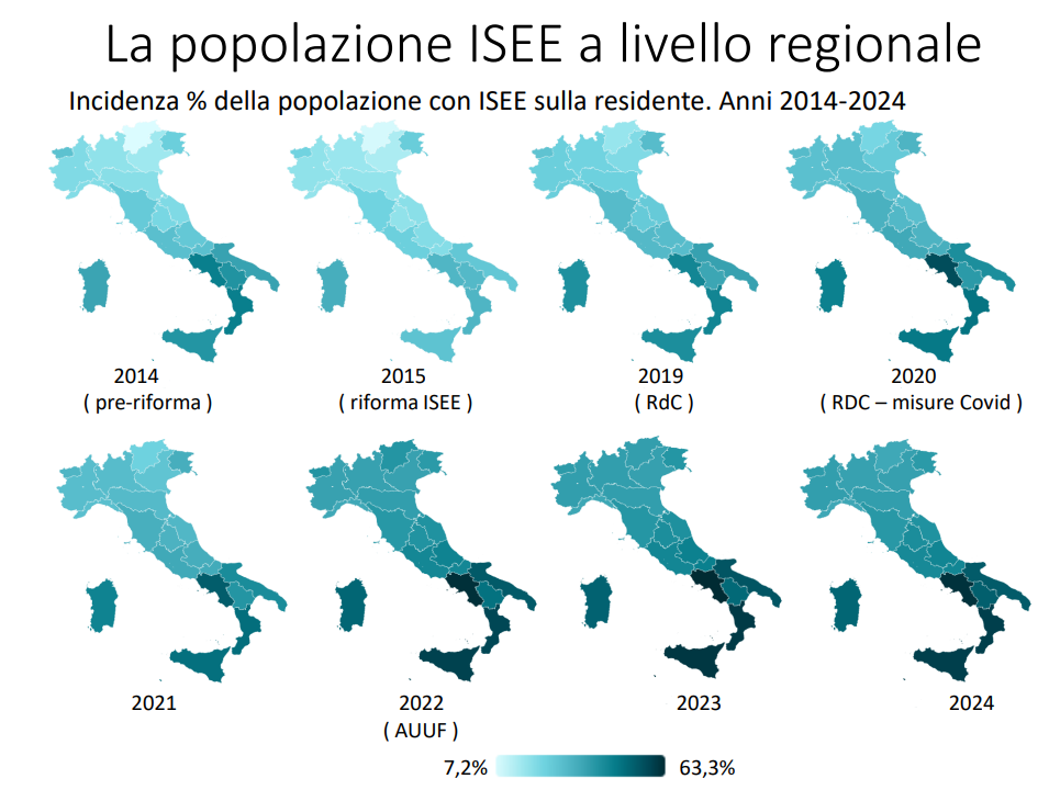 Gli incrementi più evidenti si possono notare in particolare nel 2019, con l’introduzione del reddito di cittadinanza, e poi dal 2022, anno di introduzione dell’assegno unico per i figli a carico. Nel 2023 e 2024 le variazioni sono minime, con Campania, Sicilia e Calabria a rappresentare le incidenze più elevate: le persone con ISEE sono circa il 60 per cento della popolazione residente.