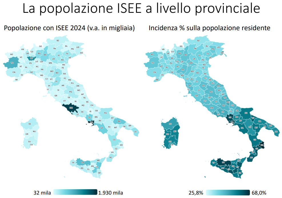Il 51,8 per cento della popolazione ISEE nel Mezzogiorno presenta un ISEE inferiore ai 10.000 euro, contro il 36,1 per cento al Centro-Nord.