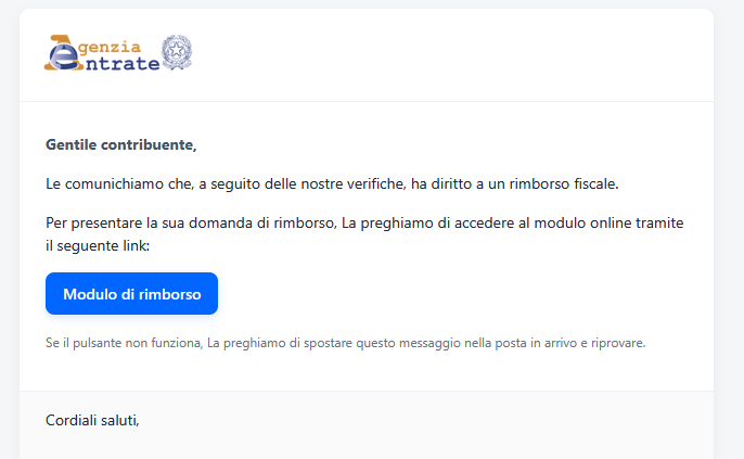 Nel corpo del messaggio è contenuto un pulsante che rimanda a un modulo di rimborso.