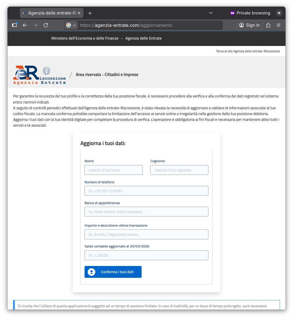 Richiesta di dati tramite la riproduzione del sito dell’Agenzia delle Entrate Riscossione: allarme sul furto di dati