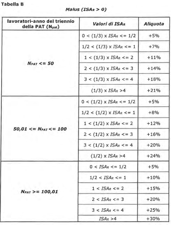 Restano invariate le aliquote in incremento del tasso medio di tariffa in caso di andamento infortunistico sfavorevole (“Malus”), previste dalla Tabella B del citato articolo 20 riportata di seguito.