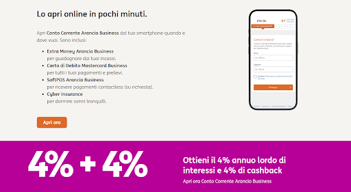 - Conto Corrente Arancio Business: gestibile interamente da App per operazioni come F24, PagoPA, CBILL e Ri.Ba;