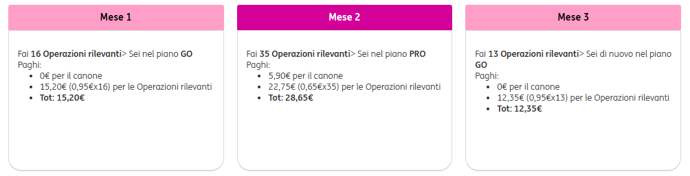 - il mese ancora successivo si effettuano 13 operazioni, si torna nel piano GO e quindi il canone costa di nuovo 0 euro e le Operazioni rilevanti 12,35 euro (0,95x13) per un totale di 12,35 euro.