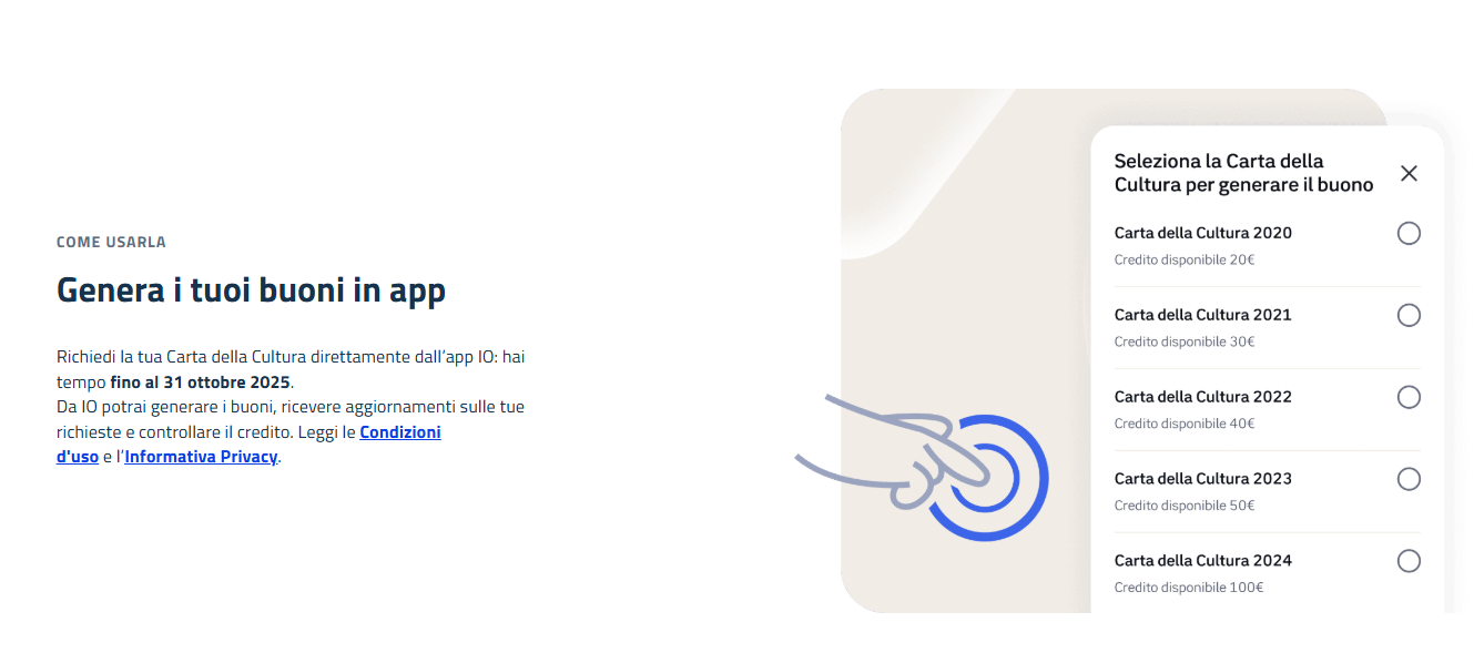 Sempre tramite l’App IO sarà notificato l’esito della richiesta, e la Carta della cultura sarà rilasciata in modalità digitale all’interno della sezione “Portafoglio” dell’applicazione. Qui sarà possibile successivamente generare i buoni, da spendere per l’acquisto di libri cartacei o digitali dotati di codici ISBN, presso i negozi fisici e online aderenti.