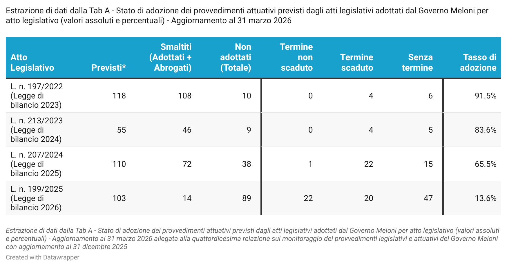 Ma l’ultimo monitoraggio pubblicato ieri, 8 aprile, non porta solo buone notizie: rispetto all’ultima rilevazione, il tasso di adozione dei decreti rallenta, passando dal 68,7 per cento al 63,6 per cento e nessuna delle Manovra approvate da inizio Legislatura può dirsi conclusa.