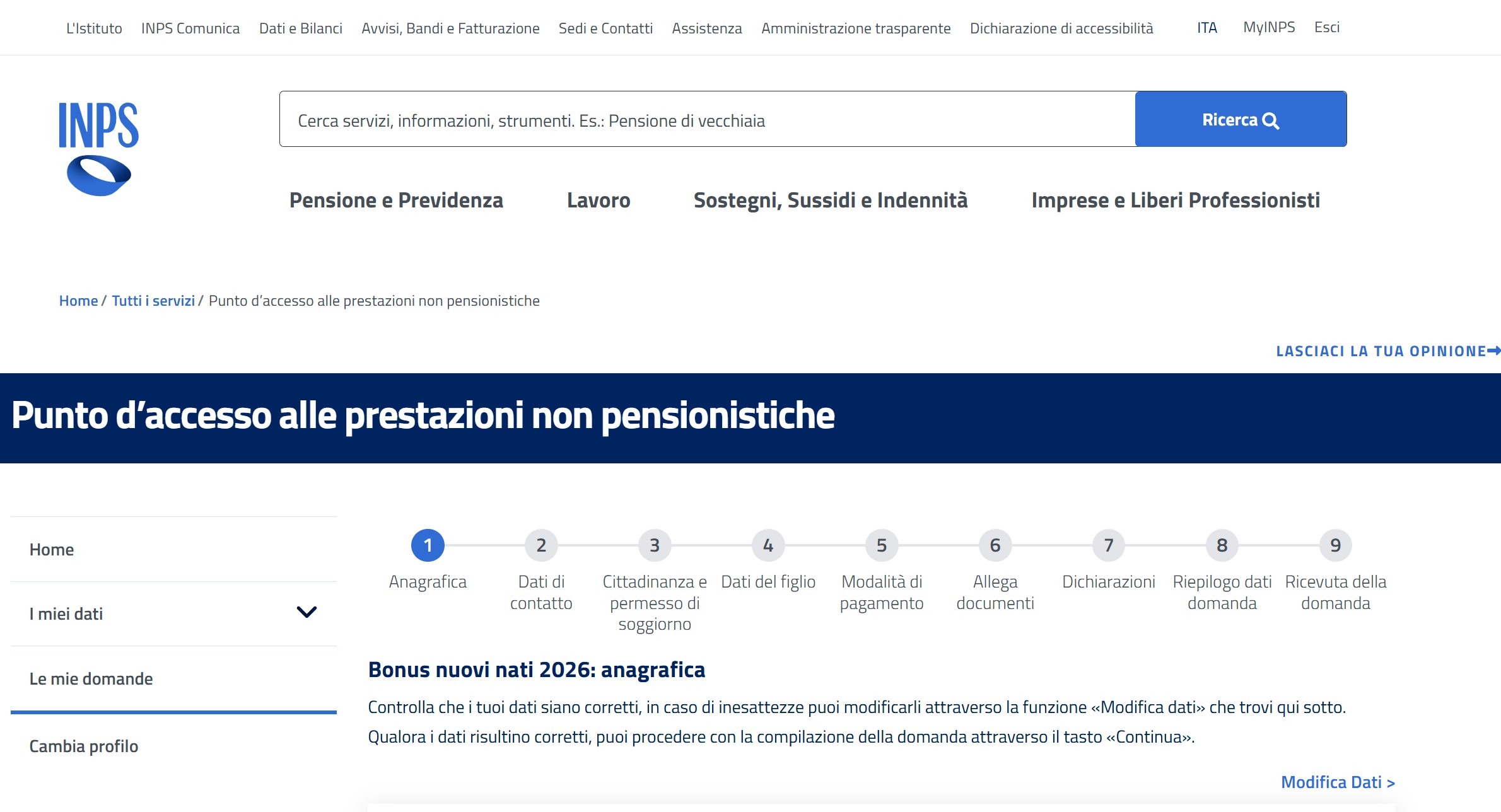 Una volta all’interno della procedura bisogna compilare tutte le sezioni del modulo con le informazioni richieste. Le sezioni ca compilare (che in parte possono essere già precompilate dall’INPS) sono 9:
