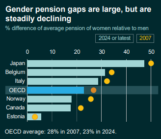 In media nei paesi OCSE le donne ricevono pensioni mensili che sono inferiori di circa un quarto rispetto a quelle degli uomini. In media c’è una differenza del 23 per cento.
