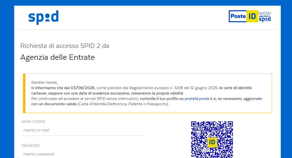 In questi giorni, infatti, sui siti della pubblica amministrazione a cui si può accedere con lo SPID sta apparendo un avviso che mette in guardia cittadini e cittadine in merito alla scadenza del documento in formato cartaceo. Di seguito la schermata che appare ad esempio sul sito dell’INPS e su quello dell’Agenzia delle Entrate quando si prova ad accedere con lo SPID di Poste.