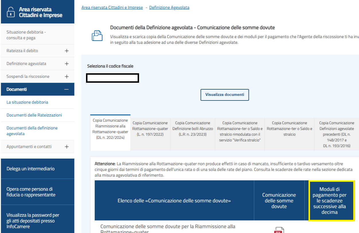 Nella sezione del portale dedicato alla rottamazione quater, denominato “Documenti della Definizione agevolata - Comunicazione delle somme dovute”, è possibile cliccare sulla voce “Moduli di pagamento per le rate successive alla decima”.
