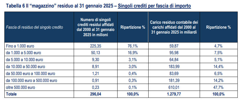 Sul totale del magazzino delle somme da riscuotere alla data del 31 gennaio 2025, il 76,1 per cento dei crediti appartiene proprio alla fascia fino a 1.000 euro.