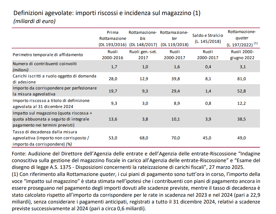 Mentre la seconda ribadisce criticità più volte sottolineate: in particolare, “la possibilità che la misura possa ridurre la compliance fiscale, il rischio che l’Erario possa diventare un “finanziatore” dei contribuenti morosi, incentivando l’omesso versamento come forma di liquidità, l’incertezza sugli effetti sui saldi di finanza pubblica, potenzialmente negativi, soprattutto se le adesioni dovessero superare le stime iniziali”.