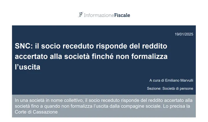 Articolo originale pubblicato su Informazione Fiscale qui: SNC: il socio receduto risponde del reddito accertato alla società finché non formalizza l’uscita