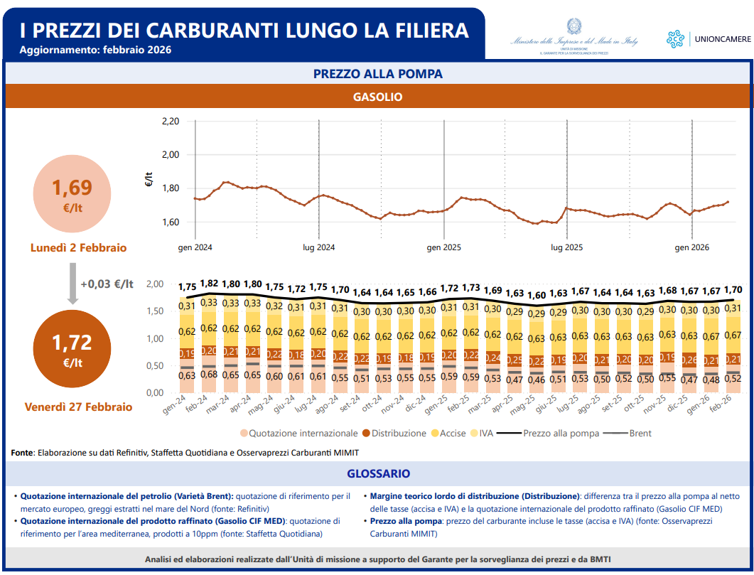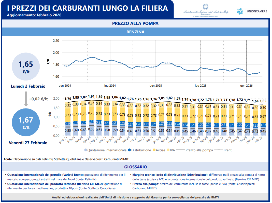 Di seguito le tabelle dell’osservatorio sui prezzi del MIMIT, aggiornate a febbraio 2026 (dove quindi non si vedono i pieni effetti del recente aumento dei prezzi), con l’andamento del prezzo di benzina e gasolio e delle voci che lo compongono.