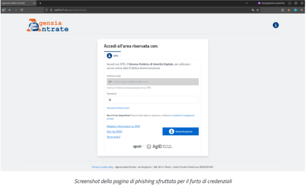 La pagina web fasulla, infatti, presenta agli utenti una falsa schermata di accesso all’area riservata dell’Agenzia delle Entrate che riproduce un modulo di login tramite SPID contraffatto. In particolare, viene richiesto all’utente di inserire la sola password della propria identità SPID, mentre l’indirizzo email della vittima è già precompilato tramite personalizzazione del link.